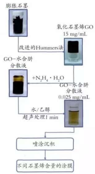 将制得的GO与还原剂水合肼制成混合分散液,将该分散液喷涂在已预热的基底上。该方法的优点在于制备涂膜的同时还原了氧化石墨烯,通过简单步骤制得致密的导电性石墨烯涂膜,其表面电阻为2.2×103Ω/sq,在波长550nm下透光率高达84%。石墨烯导电涂料也可通过旋涂工艺施工,涂膜表面电阻可低至102~103Ω/sq,在550nm波长下透光率达到80%。