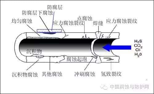 海管的腐蚀形式与其所处的海洋环境和采取的防腐蚀措施密切相关,按腐蚀位置不同可以分为管内腐蚀与管外腐蚀。引发海管内腐蚀的因素有 :防腐蚀设计缺陷、施工质量、管内输送介质和运行中的防腐蚀管理不当等。①防腐蚀设计缺陷主要表现为初始设计参数与投产后不符,如文昌油田某海管原设计CO 2含量仅为7.48%,且不含H 2 S,投产后CO 2 含量最高达到20%,且存在少量H 2 S,发生腐蚀穿孔事件;②施工质量得不到保证,管道制作及安装过程存在焊接、内涂等过程,任何一个环节没有按照相关标准和规范操作,都有埋下腐蚀隐患。如焊接时的夹杂、内涂时的针孔等都会导致局部腐蚀的发生;③管内输送介质通常含有H 2 S、CO 2 、CI - 、CO 3 2- 、SO 4 2- 、水、细菌、固体沉凝物等。它们都会引起管壁减薄、坑蚀氢脆或应力腐蚀开裂,从而导致管体破坏;④运营阶段防腐蚀管理不当,海管投用后没有根据实际生产工况进行化学药剂筛选;没有采取除氧、脱硫、除砂、脱水和露点控制等防腐蚀工艺,都会导致腐蚀加剧。海管所处的环境为海水或海底沉积物,是一种非常强烈的腐蚀环境 。就外腐蚀的影响因素而言,主要有海水腐蚀、土壤腐蚀、微生物腐蚀等。海管外腐蚀形式与其所处的海域海水深度和海底地形有关。海水含氧量是影响海水腐蚀的主要因素,海水流速也会影响管线的腐蚀速度。由于海水受到波浪和海流的作用,空气中的氧离子更容易溶解到海水中并扩散到金属表面,从而使海管的腐蚀速度加快。海洋中存在着种类繁多的微生物,附着在海管表面形成生物膜,膜内微生物的活动引发海管的腐蚀。另外,船锚或拖网也会损坏海底暴露管道涂层,埋入海底的管道由于覆盖流砂的移动,使管线暴露或成为悬空状态,在海底湍流作用下损坏管道涂层,这都会导致海管外腐蚀的发生。